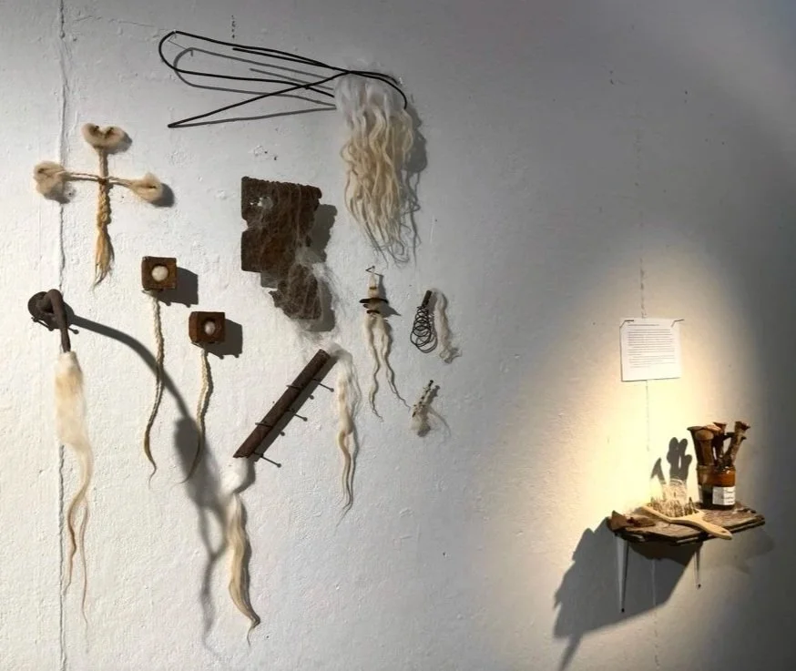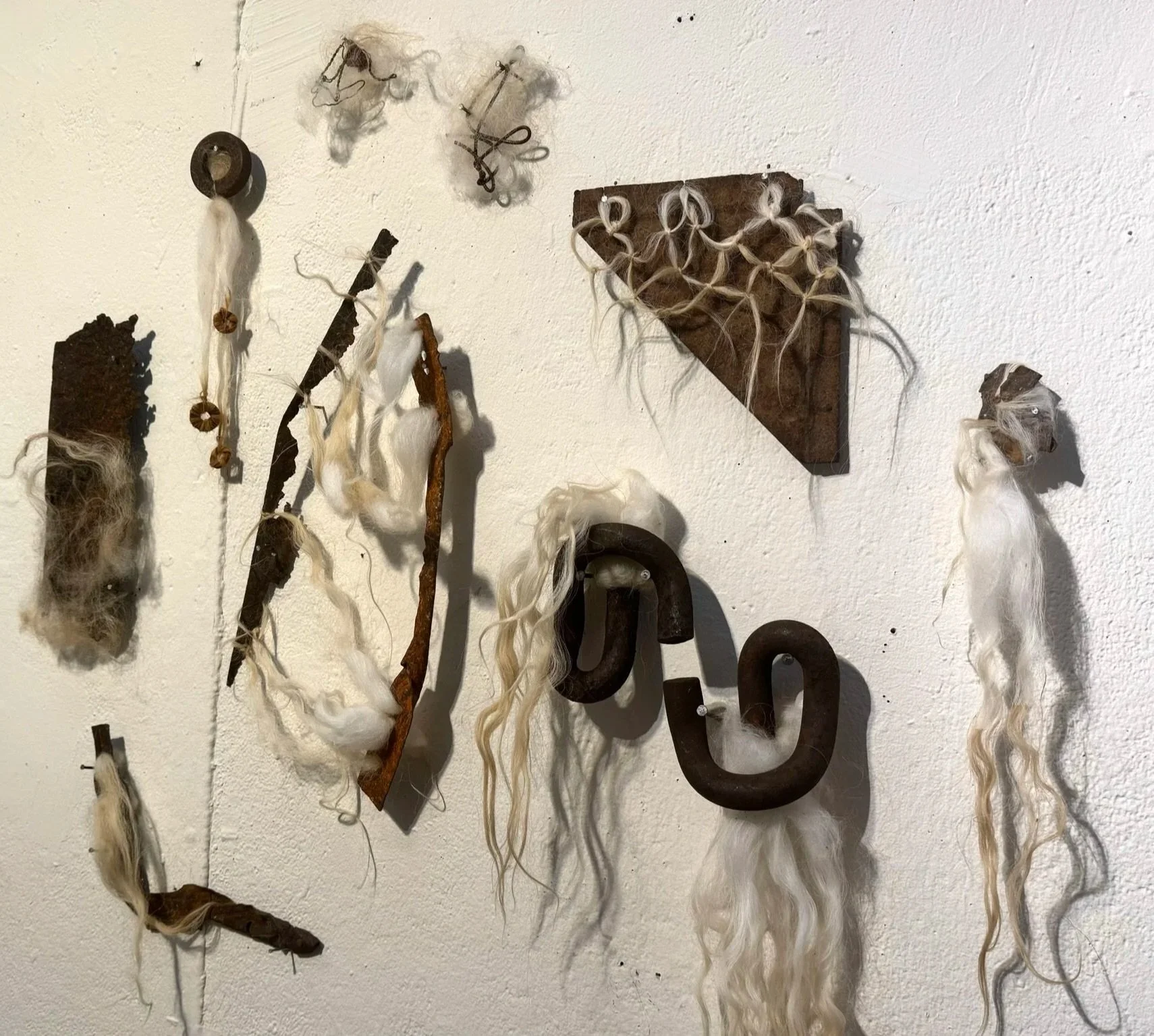 Hair dyed with rust and then knotted, tied, braided, stretched, and felted around the rusted piece.