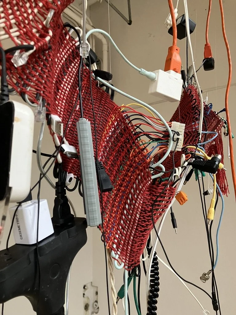 The Cable Tapestry is an exploration of the ideals of Western progress that promote unregulated advancement without consideration for its detrimental costs. Made primarily from obsolete electronics, it ponders the American culture of excess and waste, energy consumption, and the unspoken role of extraction and human exploitation.